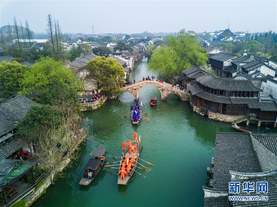 3月29日,烏鎮(zhèn)水鄉(xiāng)百姓在烏鎮(zhèn)西柵景區(qū)參加名為“踏白船”的傳統(tǒng)水上競(jìng)技活動(dòng),吸引游客前來感受水鄉(xiāng)獨(dú)特的民俗風(fēng)情?!疤ぐ状备?jìng)賽的目的是為了祈求蠶桑豐收。