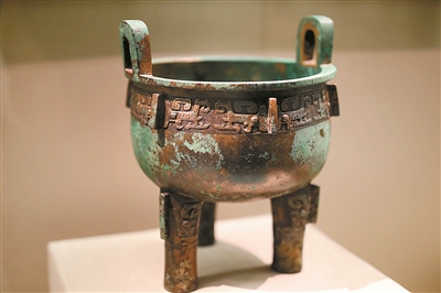 在此次展出的青銅器中,有一部分是僅銘有族氏銘文的,即家族的名號(hào),以表示是該物品的所屬人。代表族徽的銘文,象形的程度會(huì)比較高,主要用作禮器。比如展出的鳥(niǎo)父甲鼎,內(nèi)里的銘文就是自上而下三個(gè)字,其中“鳥(niǎo)”字則幾乎完全是鳥(niǎo)的象形,這個(gè)鳥(niǎo)就是鳥(niǎo)族的族徽,鳥(niǎo)族族群在當(dāng)時(shí)十分龐大。而后面兩個(gè)字就是“日名”,日名是指古人對(duì)逝人的稱謂,一般以甲乙丙丁戊己庚辛壬癸十天干前加上受祭者的輩分格式出現(xiàn)。這種禮器又叫做日名器,既點(diǎn)明了受祭者,又表明了作器者和受祭者的關(guān)系。