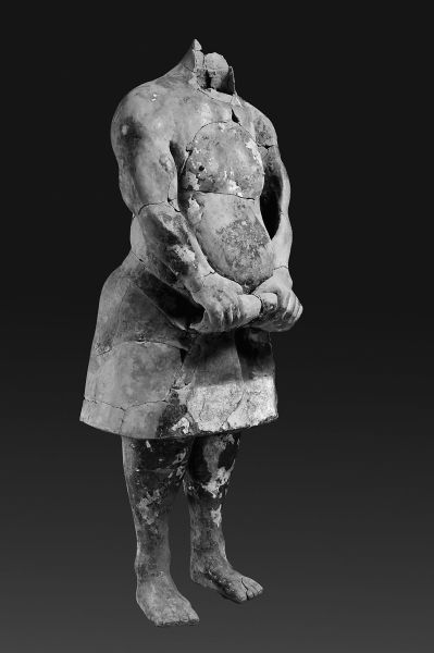 修復(fù)時(shí),每個(gè)俑都是從腳往上拼,往往先用扎帶臨時(shí)固定,等整個(gè)形狀基本拼對(duì)出來(lái)再粘接。每個(gè)碎片則要參考探方、過(guò)洞等出土信息,逐一辨認(rèn)身份,避免它們跟錯(cuò)了“主人”。這么多碎片在一起,有的資料不全,沒(méi)有編號(hào),無(wú)法確認(rèn);有的頭在這個(gè)過(guò)洞,胳膊卻跑到那個(gè)過(guò)洞了。站立的陶俑比跪射俑更難,因?yàn)樗麄冎匦母?,出土?xí)r往往破碎得更為嚴(yán)重。有時(shí)缺那么一片,翻來(lái)覆去就是找不著,真是大海撈針的感覺(jué); 得來(lái)全不費(fèi)工夫的意外之喜也有。但缺失較多的,劉江衛(wèi)堅(jiān)持等——盡量不去補(bǔ)全,他說(shuō):“咱干的是良心活兒?!?/p>