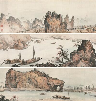 關(guān)于長(zhǎng)卷《漓江百里圖》。他意味深長(zhǎng)地回顧說(shuō):“是年秋我從韶關(guān)到了桂林,得阮退之推薦,認(rèn)識(shí)李焰生,經(jīng)其介紹,住進(jìn)七星巖公寓舊房子,家具十分簡(jiǎn)陋,只有一張二尺多長(zhǎng),一尺多寬的小桌子,勉強(qiáng)可以畫些小品之類,根本無(wú)法展開(kāi)畫大幅。我欠房東錢,他幫我擔(dān)保,后又被邀住進(jìn)其家。幸得可以在其家廳中的八仙桌上作畫,而作長(zhǎng)卷則只好蹲或趴在地下屈就。我日夜不停,苦戰(zhàn)了近兩月,終于完成《漓江百里圖》。我將其放在桂林的第一次畫展中展出。畫展結(jié)束,我把小幅畫出賣,權(quán)作生活費(fèi)。但此長(zhǎng)卷則隨身攜帶。1942年在四川樂(lè)山展出時(shí),武漢大學(xué)教授吳其昌先生觀后扶病題跋。1980年我請(qǐng)榮寶齋張貴桐老師傅將長(zhǎng)卷和題跋精裱,合二而一,永存紀(jì)念?!笨梢?jiàn)關(guān)老對(duì)此長(zhǎng)卷之珍愛(ài)!