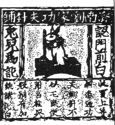 “濟南劉家功夫針鋪”銅雕版的驚人之處還在于,它是用動物形象作為商業(yè)廣告的最早實例。玉兔搗藥是與嫦娥奔月有關的傳說,民間流傳有多種版本,此處商家選用白兔作為商標的初衷耐人尋味,有人猜測是因為玉兔搗藥所用的鐵杵讓人聯(lián)想到鐵杵磨成針的典故。