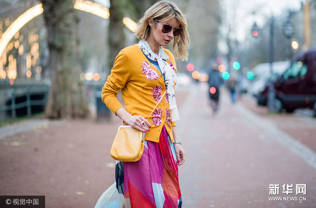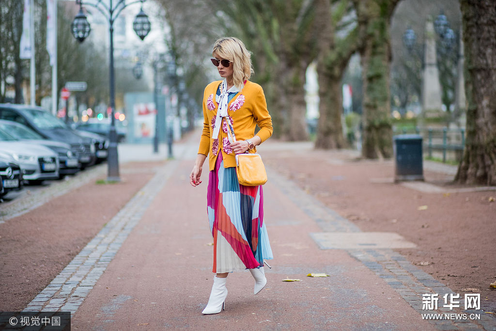 ??? 近日,德國杜塞爾多夫,時(shí)尚博主Gitta Banko街拍。她戴Miu Miu茶色墨鏡,身穿Steffen Schraut橘色亮片拼貼針織開衫,內(nèi)搭Steffen Schraut白色蝴蝶印花系帶雪紡襯衫,Steffen Schraut拼色百褶紗裙,肩背Volker Lang橘色口金包,腳踩Kurt Geiger白色尖頭高跟短靴。