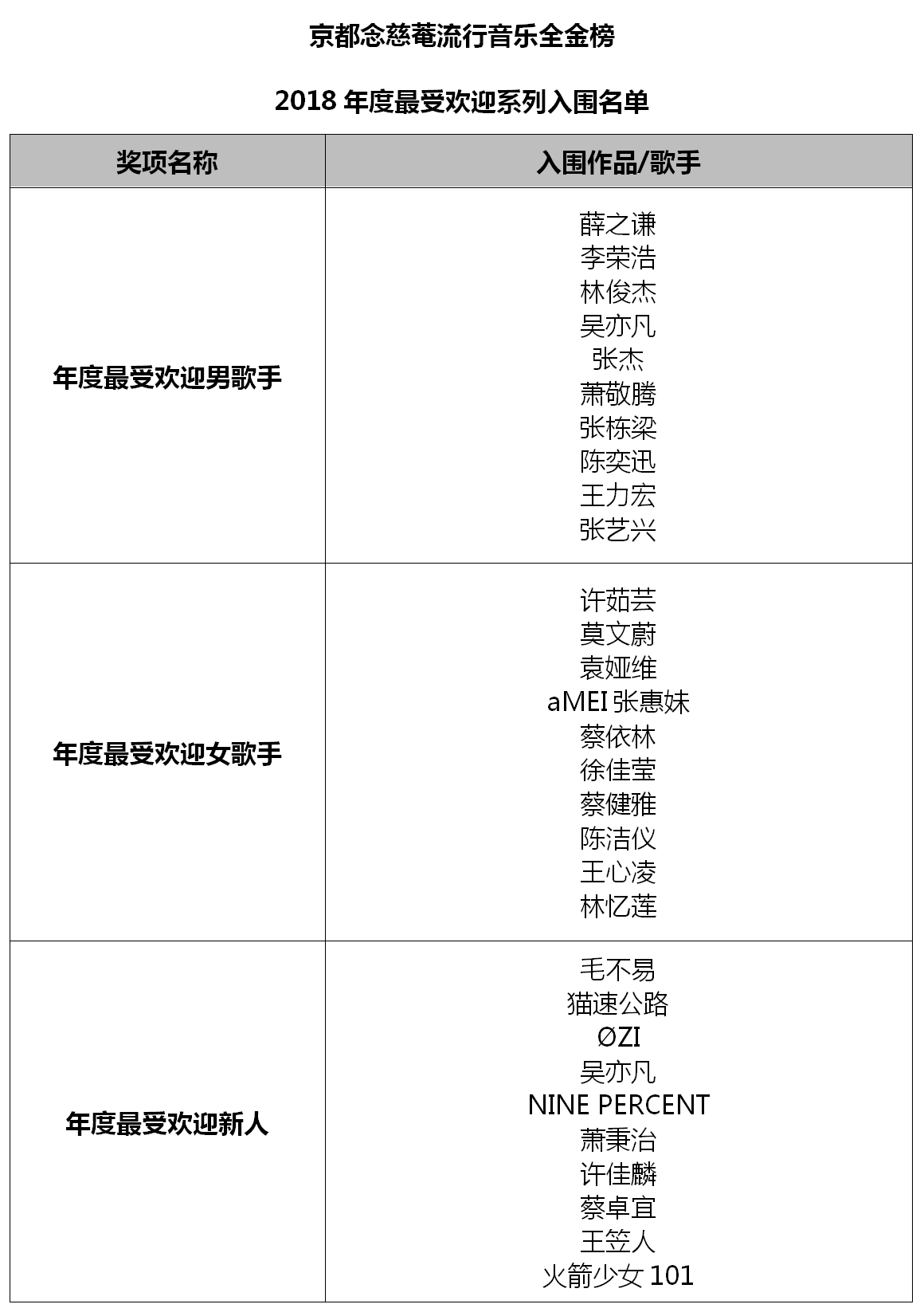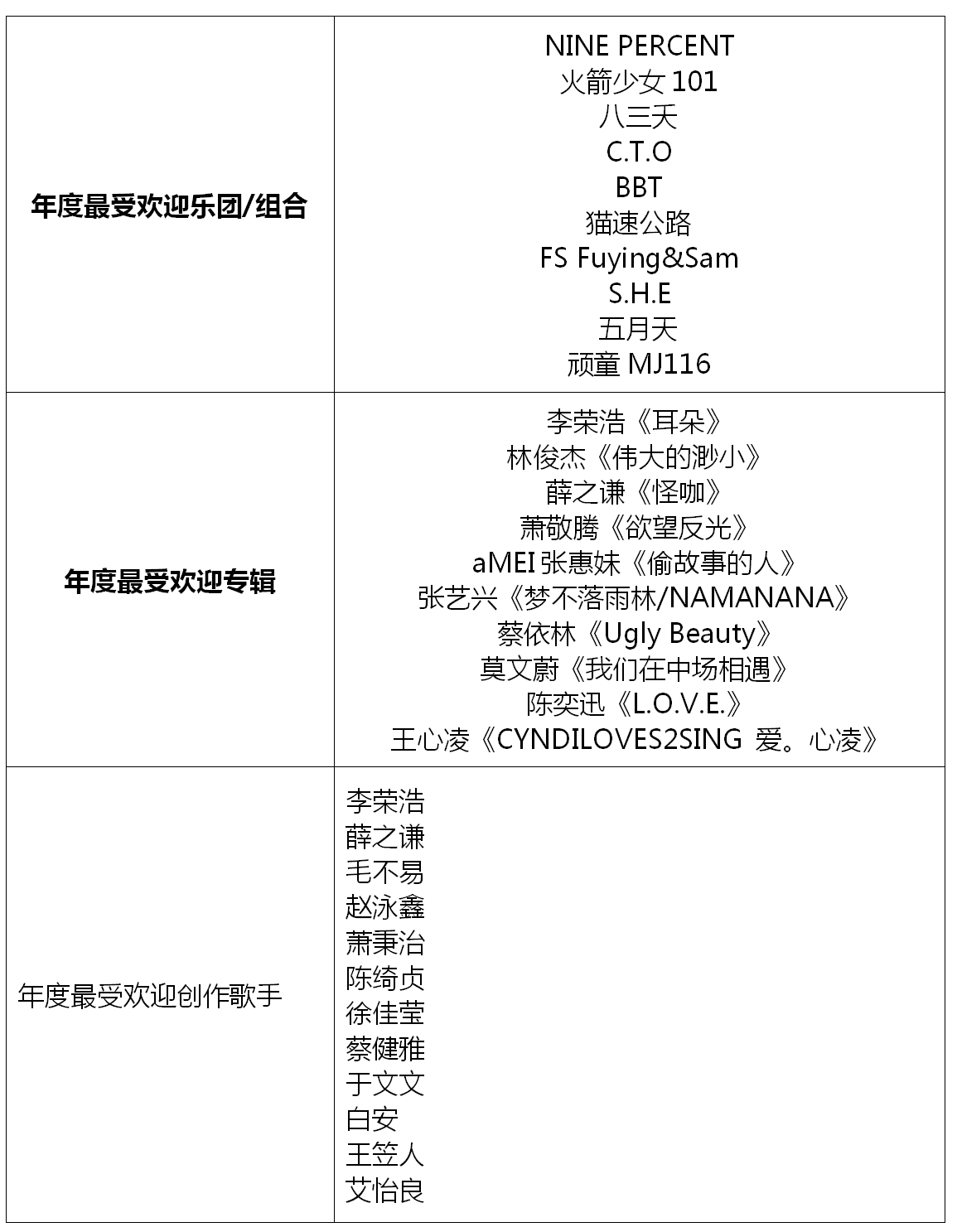 “年度最受歡迎樂隊(duì)/組合”入圍名單中,同在2018年成功舉辦巡回演唱會的五月天、S.H.E等老牌組合的進(jìn)榜,讓大家看到了華語樂壇常青樹的非凡音樂實(shí)力;八三夭、C.T.O、BBT、FS Fuying&Sam、頑童MJ116等組合,憑借不減反升的人氣魅力實(shí)力進(jìn)榜;而NINE PERCENT、火箭少女101及貓速公路等新人組合的二次入圍,不僅僅是對他們在音樂成績上的肯定,更是對其未來之路的鼓勵(lì)。