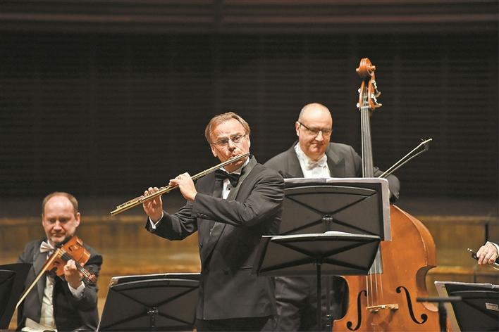 長笛大師安德烈· 格里米內(nèi)利與意大利愛樂獨(dú)奏家室內(nèi)樂團(tuán)音樂會。 深圳特區(qū)報記者 胡蕾 攝