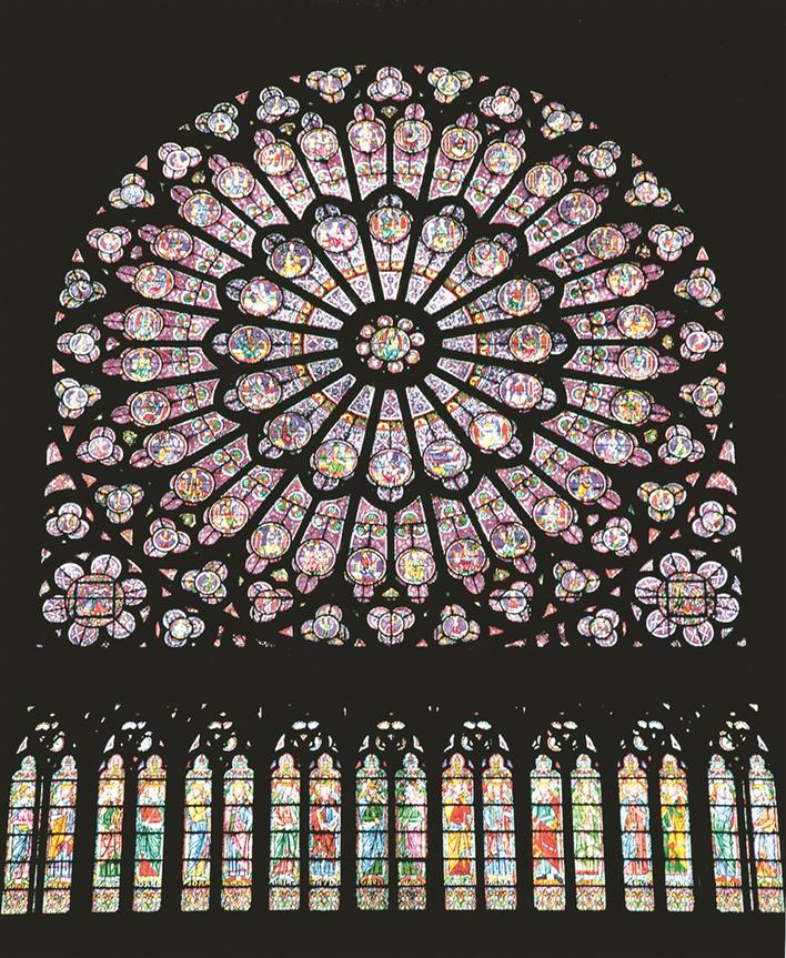 彩繪玻璃花窗“玫瑰花窗”也是巴黎圣母院內(nèi)的重要文物。18世紀(jì),巴黎圣母院在路易十四統(tǒng)治時期經(jīng)歷了一次大修,12世紀(jì)留下的彩色玻璃窗被換成了透明玻璃窗,只有三扇玫瑰彩色玻璃窗被保留下來,也成為圣母院如今的著名景觀之一。在雨果的小說《巴黎圣母院》熱銷后,巴黎民眾和政府官員開始呼吁對這一“寶藏”進行修復(fù)。1844年,在建筑大師維歐勒·勒·杜克的帶領(lǐng)下,修復(fù)了圣母院的西立面、國王畫廊,還添加了十二圣徒雕塑以及圣母院屋檐上著名的怪獸雕塑。