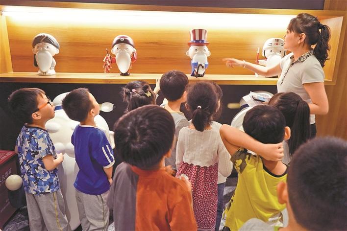“儒·時光”極具藝術性。一尊大大的hello kongzi雕塑通過3D投影呈現(xiàn)不同的視覺效果,流光溢彩,熠熠生輝?!皾h字傳奇”則是通過游戲的方式,向觀眾介紹甲骨文的由來,十二生肖的甲骨文從光影墻上落下,觀展者觸摸,這個生肖字即變成對應的動物,演變過程十分生動,漢字的“象形”性由此可見一斑。新增的展覽項目為“hello kongzi國學角”,參觀者可通過平板電腦里的博林文創(chuàng)自主研發(fā)的二十四節(jié)氣小游戲、詩詞動畫游戲等走進傳統(tǒng)文化。在當日的參觀活動中,小朋友們感到十分新鮮好奇,尤其被游戲?qū)傩詮娏业摹吧舷挛迩辍薄皾h字傳奇”牢牢吸引。而可愛的hello kongzi形象也讓他們覺得十分親切,傳統(tǒng)文化的種子不知不覺地埋在了心田。