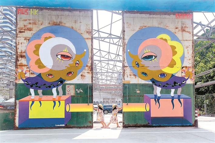 在城市公共空間中,涂鴉藝術(shù)不僅是一種重要的人文景觀,同時(shí)還能給人一種視覺享受,使單一的生活變得富有色彩。來自中國(guó)香港的全職藝術(shù)家彭怡擅長(zhǎng)用涂鴉進(jìn)行故事創(chuàng)作,作品《雙觀》以左右對(duì)稱相望的停車場(chǎng)守護(hù)神的形象感染車主與行人,傳達(dá)平穩(wěn)冷靜的力量。同樣來自中國(guó)香港的涂鴉藝術(shù)家曾昭昶,利用文字涂鴉作品的視覺誤差,嘗試突破停車格的物理范圍,將平面轉(zhuǎn)為立體,帶來作品《內(nèi)&外》。