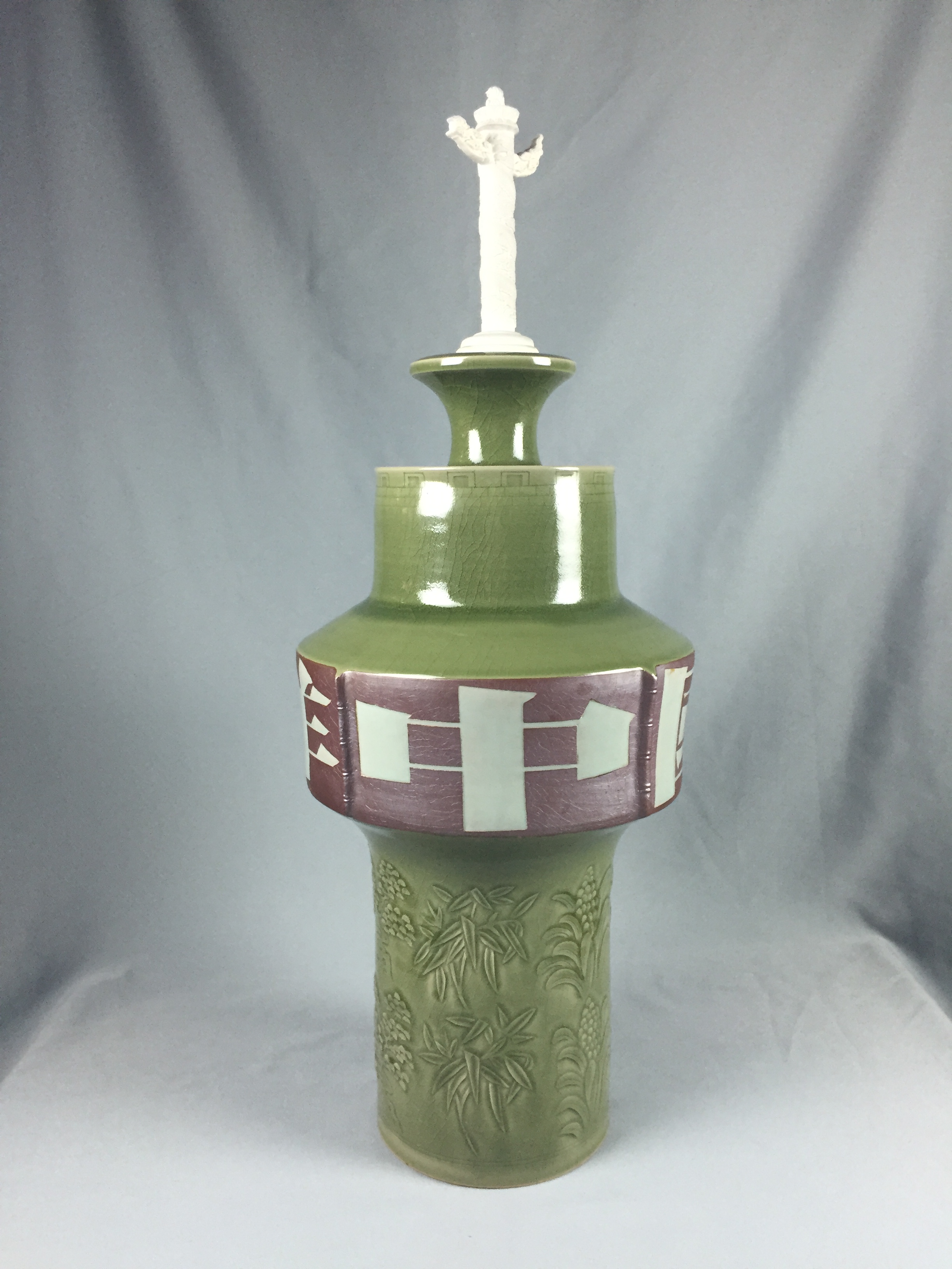 此次參與展出的青瓷作品中,一件名為“紅底玉縷耀瓷刻花松竹萬年青紋中國吉祥”的青瓷作品人氣頗高。據(jù)介紹,此件作品由中國工藝美術(shù)大師孟樹鋒親自制作。作品整體呈現(xiàn)“中”字造型,偉岸挺拔,雄渾方正,險峻奇特而大氣磅礴。瓶頂一尊華表,白泥素胎,一如漢白玉石雕。瓶肩梢高凸又微微外撇,是一圈五十六個垛峰與垛口的萬里長城,代表著中國五十六個民族團結(jié)一心。其下碩腹,則使用耀州紅底玉縷的工藝書寫“中國吉祥”四個雕版大字,點明作品主題。下部立柱上刻、劃、貼花的萬年青、青松、竹子,體現(xiàn)耀州瓷的風格并以此祝福祖國。