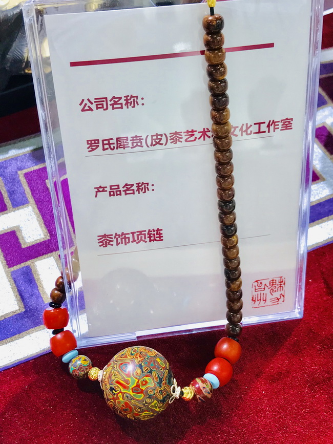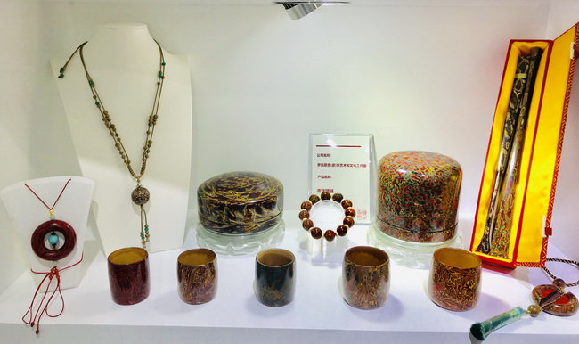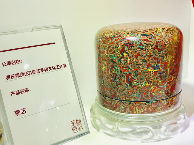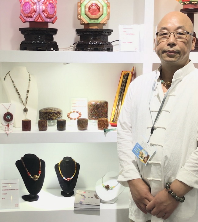 浙江省組團的展位在會展中心2號館,規(guī)模不小,羅獻兵老師的漆藝作品都比較精致,但展位卻比較舒展。一眼望去,五彩斑斕的漆藝作品令人眼花繚亂,精神為之一震,主要作品有犀皮漆扇、印盒、糖果盒、竹胎茶杯、腰墜以及手串和漆珠等。前來參觀的人不少,但從他們的言談中得知了解的并不多,多為其絢麗的光彩所吸引。