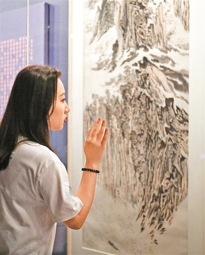 展覽一經(jīng)推出,就迅速吸引了絡繹不絕的市民前來參觀。面對暑期人流量大的情況,關館特地推出了豐富多樣的公共教育服務。不僅有志愿者導覽,還有親子工作坊、數(shù)字化設計等等,內(nèi)容接地氣,趣味橫生。記者看到不少孩子都在家長的指引下拿著畫本在美術館里臨摹、學習,通過這種方式與國畫家們一起交流切磋。