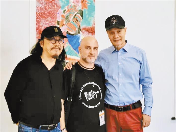 樊鴻賓(右)、鄒明(左)在畫展上與當(dāng)?shù)厮囆g(shù)家合影。(主辦方供圖)