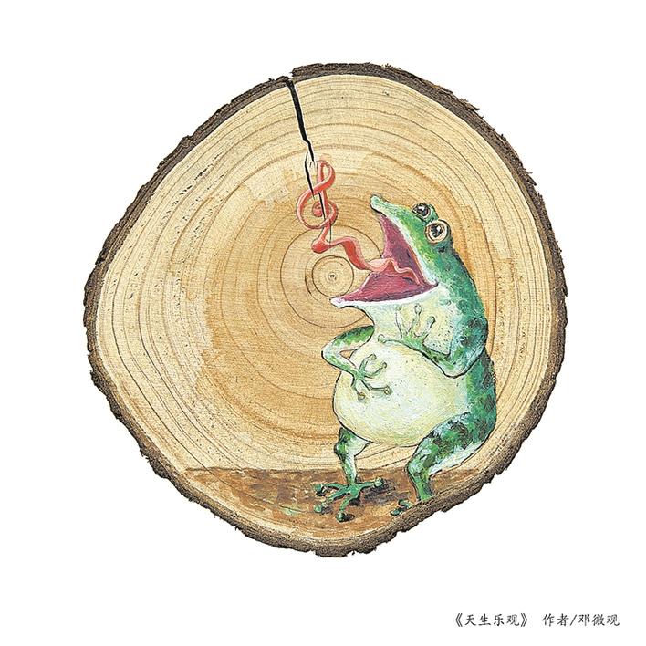 上榜漫畫家鄧微觀系深圳市寶安區(qū)打鐵文藝社社長,其《感物系列》以見物興感為主線,展開豐富的想象力,用動(dòng)物擬人的方式幽默詼諧地抒發(fā)人生感悟,讓人會(huì)心一笑之余引起共鳴,令觀眾感嘆藝術(shù)家的漫無邊際的“腦洞”。對(duì)于作品首次入選國內(nèi)美術(shù)界規(guī)格最高的國展,鄧微觀很興奮:“這是對(duì)我這個(gè)系列作品的高度肯定?!薄陡形锵盗小废盗凶髌吩从谒e逛發(fā)呆時(shí)的想象碎片,將這個(gè)碎片貫穿就成了這個(gè)系列作品。鄧微觀在茶余飯后經(jīng)常到鐵崗的西鄉(xiāng)河邊散步,河中不時(shí)傳來低頻厚實(shí)的“男低音”引起他的注意,此起彼伏,聽來如交響曲一般通達(dá)舒暢。他循聲尋覓,原來是蛤蟆的聲音,只見這些“音樂家”在下水道洞口,在草叢中,河道縫中快樂地歡唱……這些天生的樂觀者給鄧微觀帶來美妙的心情,所以創(chuàng)作了這幅《天生樂觀》。再如《三餐之余》,有時(shí)飯后經(jīng)常會(huì)在茶幾前發(fā)發(fā)呆,思考人生不應(yīng)該只是面包和蘋果,還應(yīng)有點(diǎn)別的……