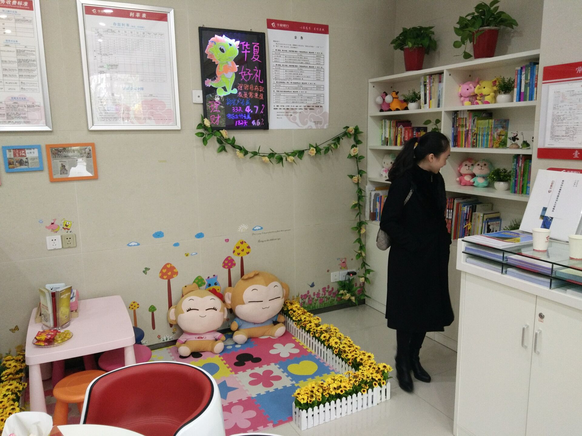 記者發(fā)現(xiàn),除了便捷的金融設施,在每一位員工的辦公座前,都擺放著一個電子相冊,上面滾動播放著一些孩子的笑臉照或親子游戲照等,畫面間流露著快樂。其中,在一位工作人員辦公桌的側板上,快樂的笑臉照被打印出來,集滿了整張墻。據工作人員表示,這些照片大多都是客戶在參與支行組織的活動時留下來的,不知不覺,就匯聚成了現(xiàn)在的照片墻。除此之外,網點內還設有圖書角、兒童樂園等,開放給社區(qū)居民使用,提高顧客的服務體驗,有些家長帶孩子來辦理物業(yè)時,就感覺像回到了自己另外一個家一樣。
