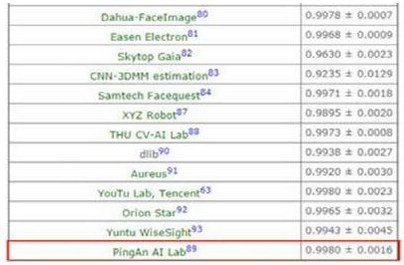 5月9日,國際權(quán)威人臉識別數(shù)據(jù)庫LFW(Labeled Faces in the Wild)最新公布的測試結(jié)果顯示,平安集團旗下平安科技的人臉識別技術(shù)以99.8%的識別精度和最低的波動幅度領(lǐng)先國內(nèi)外知名公司,位居世界第一。該精度為LFW所公布的最佳成績,也是平安科技人工智能實驗室取得的里程碑式成果。此外,經(jīng)國家公安部第三研究所認(rèn)證中心權(quán)威認(rèn)證,平安科技人臉識別技術(shù)同樣獲得識別精度99.84%的檢測結(jié)果,并榮獲檢測報告證書。