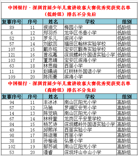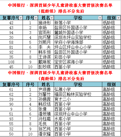 從全市近百所學(xué)校、社會賽區(qū)報(bào)名的萬余名參賽選手中脫穎而出的選手們齊聚復(fù)賽賽場,比賽競爭異常激烈。晉級復(fù)賽的225人(其中高齡組104人,低齡組121人)使出渾身解數(shù),講述著自己喜歡的故事,最終高、低齡組每組各10人晉級決賽,低齡組新蓮小學(xué)施詩彤、鹽田區(qū)外國語小學(xué)申旸等10位選手,高齡組弘雅小學(xué)尹琪善、福田區(qū)翰林實(shí)驗(yàn)學(xué)校劉馨竹等10位選手“殺出重圍”,奪得決賽名額。