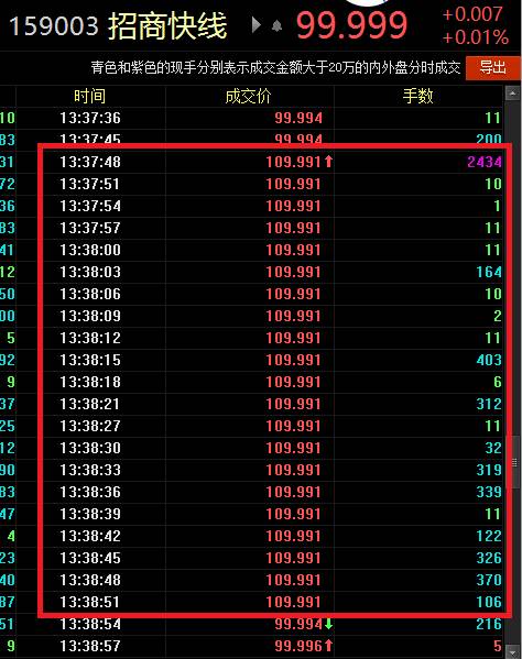 根據(jù)Wind數(shù)據(jù)顯示,招商快線13日的開盤價(jià)格為99.991,此后一直在99.990—99.995之間波動(dòng),但到13:37:48突然出現(xiàn)了2434手的大單,成交價(jià)格為109.991,在一分鐘左右的時(shí)間,同一價(jià)格上又陸續(xù)出現(xiàn)了20筆成交,隨后價(jià)格恢復(fù)到99.994。