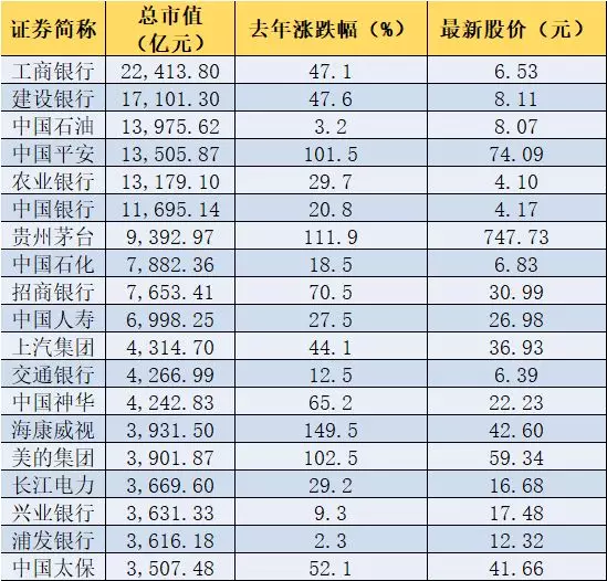 據(jù)匯大數(shù)據(jù)終端統(tǒng)計(jì),截止到今年3月20日,中國(guó)平安的市值為1.35萬(wàn)億,僅次于工商銀行、建設(shè)銀行和中國(guó)石油。在市值排名前20名的公司中,去年全年股價(jià)漲幅在100%以上的公司僅有4家,分別是海康威視、貴州茅臺(tái)、美的集團(tuán)和中國(guó)平安,漲幅分別為149.5%,111.9%、102.5%和101.5%。