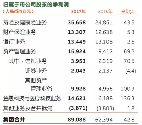 除了個(gè)人業(yè)務(wù)的大放異彩,平安集團(tuán)的核心金融業(yè)務(wù)也是年報(bào)的一大亮點(diǎn)。2017年,中國(guó)平安的壽險(xiǎn)及健康險(xiǎn)新業(yè)務(wù)價(jià)值大增32.6%,內(nèi)含價(jià)值營(yíng)運(yùn)回報(bào)率35.5%;產(chǎn)險(xiǎn)市場(chǎng)份額提升1.3個(gè)百分點(diǎn);銀行零售業(yè)務(wù)凈利潤(rùn)占比提升至67.6%。