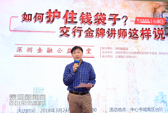 3月24日,在深圳中心書城南臺階,由深圳銀監(jiān)局指導(dǎo),深圳新聞網(wǎng)、深圳市銀行業(yè)消費(fèi)者權(quán)益保護(hù)促進(jìn)會主辦,交通銀行深圳分行承辦的大型系列公益活動“深圳金融公益講堂”第四講如期開講?;顒友埩藖碜越煌ㄣy行深圳分行的三位金牌講師從專業(yè)角度為市民朋友們詳細(xì)講解理財知識,現(xiàn)場解答市民的金融消費(fèi)困惑。