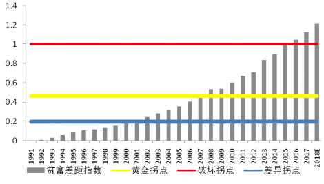 研究發(fā)現(xiàn),貧富差距指數(shù)與經(jīng)濟(jì)發(fā)展存在這三個(gè)拐點(diǎn):差異拐點(diǎn)(0.2)、黃金拐點(diǎn)(0.463)及破壞拐點(diǎn)(1)。當(dāng)貧富差距指數(shù)在0.2以下的低值區(qū)時(shí),絕對(duì)平均造成動(dòng)力不足。當(dāng)貧富差距指數(shù)高于0.2時(shí),差異的動(dòng)力效應(yīng)開始顯現(xiàn),貧富差距指數(shù)與GDP增長(zhǎng)率存在顯著的倒U型的非線性關(guān)系。而且拐點(diǎn)在貧富差距指數(shù)等于0.463左右,對(duì)應(yīng)的時(shí)間為2006-2007年之間,貧富差距在這個(gè)水平左右對(duì)經(jīng)濟(jì)增長(zhǎng)的動(dòng)力效應(yīng)最高。當(dāng)貧富差距指數(shù)低于1時(shí),貧富差距處于合理狀態(tài),合理的貧富差距提高了居民的工作動(dòng)能,有利于促進(jìn)經(jīng)濟(jì)增長(zhǎng),但超過臨界值1,隨著貧富差距進(jìn)一步提高,貧窮人口會(huì)有日益強(qiáng)烈的被剝削感,在一定程度上抑制了經(jīng)濟(jì)總量的提升。據(jù)此,近年來我國(guó)貧富差距的演變過程可以分為四大階段,分別是“財(cái)富絕對(duì)平均階段”(1991-2001年)、“差異帶來動(dòng)力,逐步接近黃金拐點(diǎn)階段”(2001-2007年)、“貧富差異擴(kuò)大階段”(2007-2015年)及“貧富分化相對(duì)嚴(yán)重階段”(2015年至今)。經(jīng)研究團(tuán)隊(duì)測(cè)算,2018年貧富差距指數(shù)預(yù)計(jì)已超過破壞拐點(diǎn)。