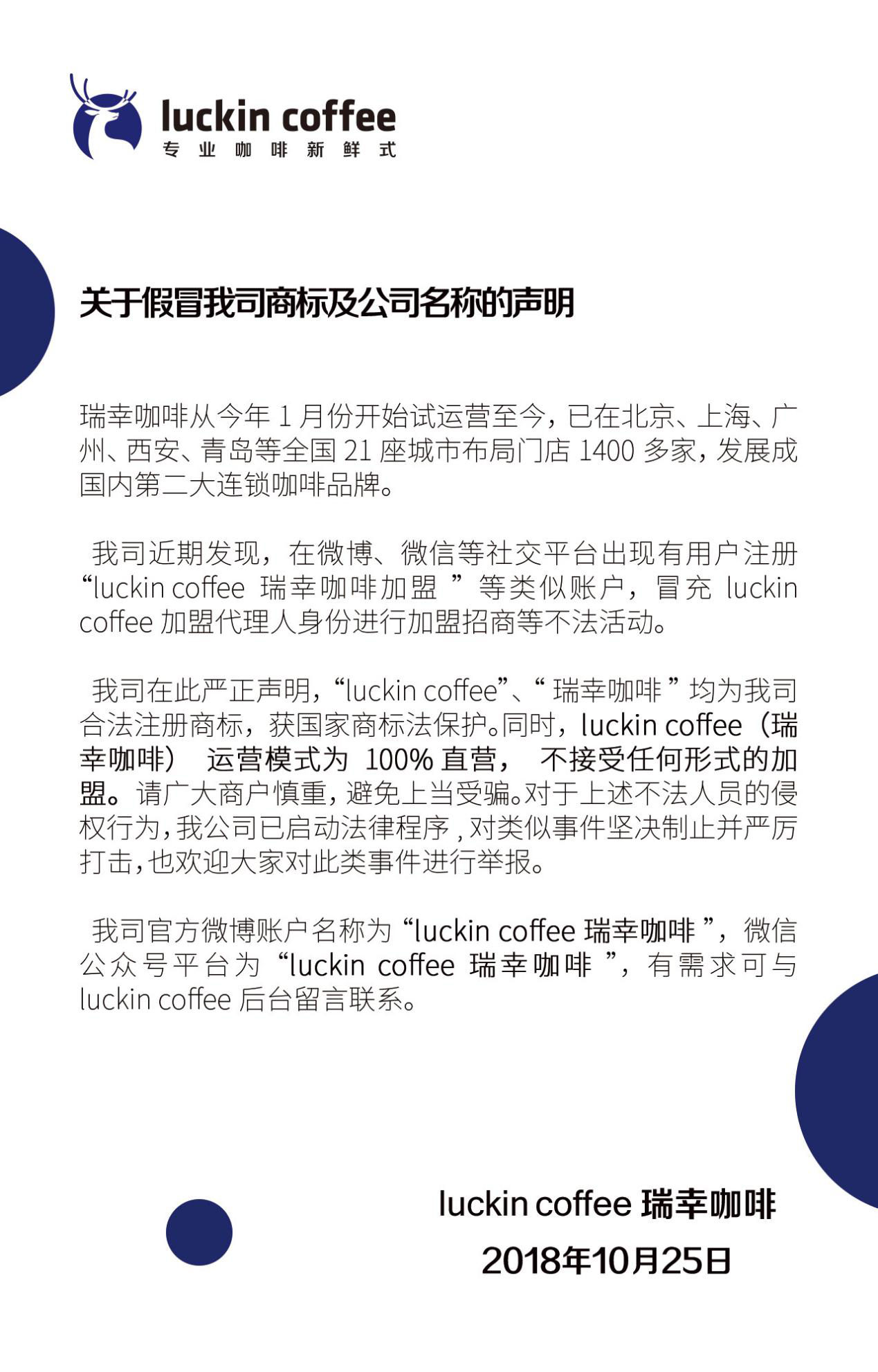 深圳新聞網訊 近日,瑞幸咖啡官宣聲明:我司近期發(fā)現(xiàn),在微博、微信等社交平臺出現(xiàn)有用戶注冊“l(fā)uckin coffee瑞幸咖啡加盟”等類似賬戶,冒充luckin coffee加盟代理人身份進行加盟招商等不法活動。luckin coffee瑞幸咖啡堅持運營模式為100%直營,不接受任何形式的加盟,請廣大商戶慎重,避免上當受騙。