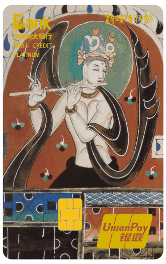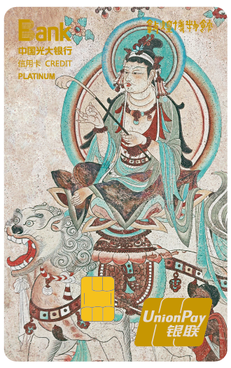 光大敦煌聯(lián)名信用卡卡面設計取材于敦煌壁畫,有敦煌大智文殊白金卡、敦煌天宮伎樂白金卡以及敦煌五百強盜成佛菁英白金卡三種信用卡。光大敦煌聯(lián)名信用卡的卡面設計靈感均來源于敦煌壁畫,大智文殊白金卡畫面為文殊菩薩結(jié)跏坐于青面獅虬首仙獅背上。文殊菩薩是專司智德、辯才第一的大菩薩,尊號“大智文殊”。天宮伎樂白金卡主體畫面為伎樂天,取材于莫高窟288窟,營造了佛陀講經(jīng)說法時佛國世界歡樂祥和的氛圍。五百強盜成佛菁英白金卡卡面設計取自“五百強盜成佛”的壁畫故事,佛用神通使被剜去雙眼的強盜重見光明,并對他們進行點化,五百強盜潛心苦修終成五百羅漢。光大敦煌聯(lián)名信用卡的卡面設計將傳統(tǒng)文化融入現(xiàn)代金融產(chǎn)品,極具敦煌文化的風格。