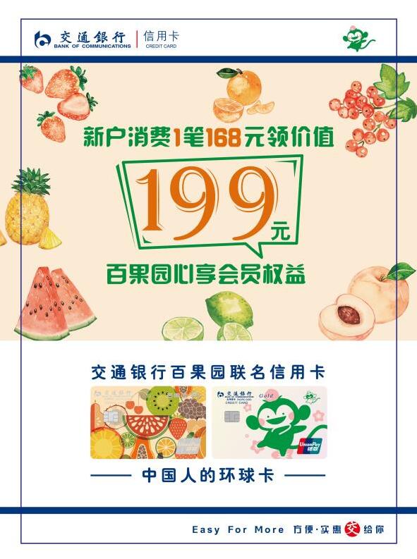 這款卡片不僅卡面超可愛,有五彩繽紛的水果圖案,也有百果園的猴果果logo,元?dú)鉂M滿;福利也很硬核,現(xiàn)在辦理交通銀行百果園聯(lián)名信用卡,新戶達(dá)標(biāo)就可以免費(fèi)領(lǐng)價值199元百果心享會員年卡,擁有它就擁有百果園的上千元權(quán)益!