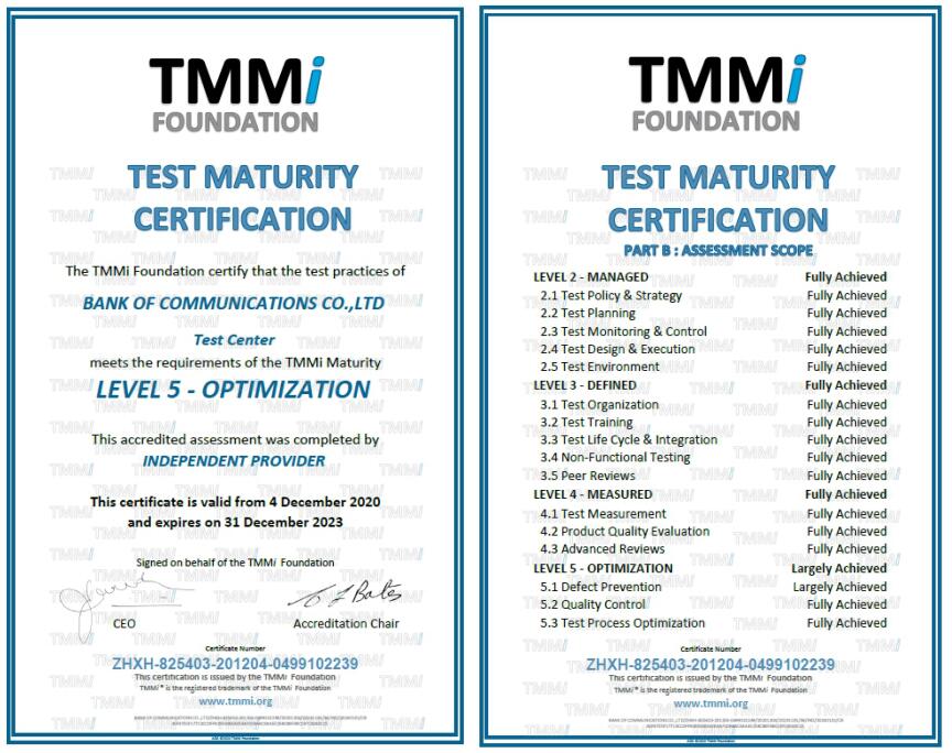 TMMi認(rèn)證是當(dāng)前國(guó)際上最權(quán)威的測(cè)試組織成熟度認(rèn)證體系,也是軟件產(chǎn)品質(zhì)量管理水平最有力的資質(zhì)證明,最高級(jí)別為五級(jí)。此次獲得五級(jí)認(rèn)證,標(biāo)志著交行的軟件測(cè)試能力、產(chǎn)品質(zhì)量管理水平、風(fēng)險(xiǎn)應(yīng)對(duì)能力、測(cè)試過(guò)程改進(jìn)能力、測(cè)試技術(shù)創(chuàng)新能力的整體成熟度均已達(dá)到國(guó)際領(lǐng)先水平。