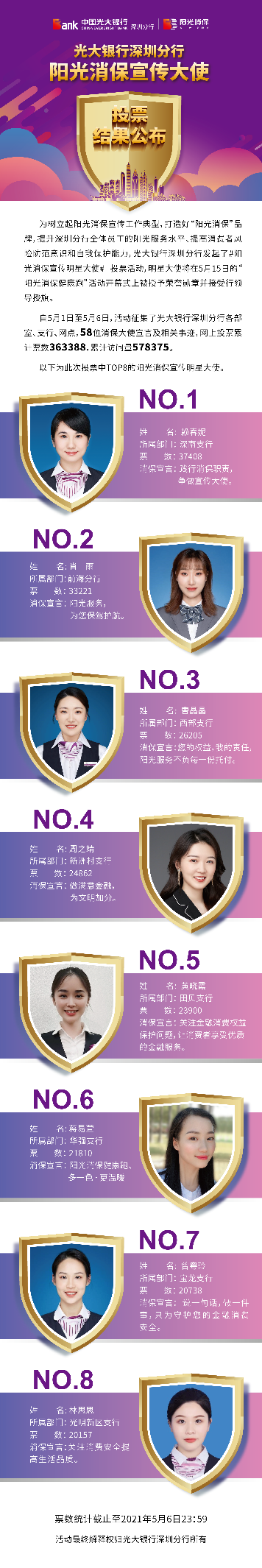 深圳新聞網(wǎng)·見圳客戶端2021年5月8日訊 昨日,光大銀行深圳分行“陽(yáng)光消保宣傳明星大使”線上投票圓滿結(jié)束,從58名宣傳大使中投票產(chǎn)生了賴春妮、肖雨、曹晶晶、周之靖、黃曉霞、蔣易萱、曾粵玲、林思思8名陽(yáng)光消保宣傳明星大使。明星大使將在5月15日的“陽(yáng)光消保健康跑”活動(dòng)開幕式上被授予榮譽(yù)勛章并接受行領(lǐng)導(dǎo)授旗。5月1日,光大銀行深圳分行發(fā)起了“陽(yáng)光消保宣傳明星大使”線上投票,旨在樹立起陽(yáng)光消保宣傳工作典型,打造“陽(yáng)光消?!逼放?,提升深圳分行全體員工的陽(yáng)光服務(wù)水平,提高消費(fèi)者風(fēng)險(xiǎn)防范意識(shí)和自我保護(hù)能力,提升光大在深圳地區(qū)的品牌影響力。投票活動(dòng)得到社會(huì)熱烈響應(yīng),據(jù)統(tǒng)計(jì),此次累計(jì)票數(shù)達(dá)363388次。