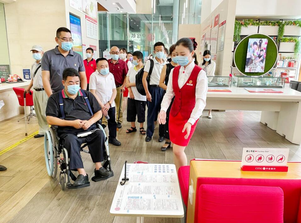 交流座談會結(jié)束后,全體黨員干部來到中信銀行深圳城市廣場旗艦支行現(xiàn)場體驗(yàn)網(wǎng)點(diǎn)無障礙設(shè)施和服務(wù),支部黨員與障礙人士現(xiàn)場溝通交流,為改進(jìn)無障礙服務(wù)提出有益建議。