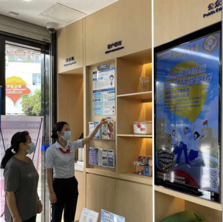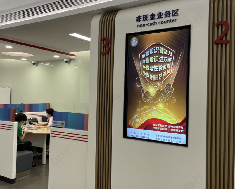 在網(wǎng)點營業(yè)大廳內(nèi),電子屏中的2021年金融知識普及月海報營造了良好宣傳氛圍。金融之手,強而有力,各營業(yè)網(wǎng)點一手承接了金融知識普及多方面的內(nèi)容,共同構(gòu)建了線上線下、電信、網(wǎng)絡(luò)等多渠道傳播的金融知識普及傳播網(wǎng),有力推進,勢在必行。
