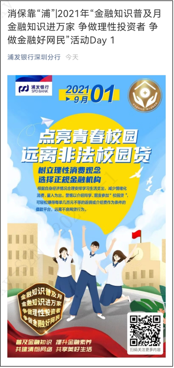 9月1日,也是校園開學(xué)的日子。開學(xué)的第一天,浦發(fā)銀行深圳分行特別推出“點亮青春校園遠離非法校園貸”日歷宣傳海報,并在官方微信公眾號進行轉(zhuǎn)發(fā)宣傳,同時在46家網(wǎng)點營業(yè)大廳顯示屏播放,重點傳播校園貸金融知識,提醒學(xué)生人群,合理消費,遠離不良網(wǎng)貸行為。據(jù)悉,該行將在九月每個工作日持續(xù)發(fā)布消保宣傳日歷,常態(tài)化長效推進金融知識普及月宣傳活動的開展。