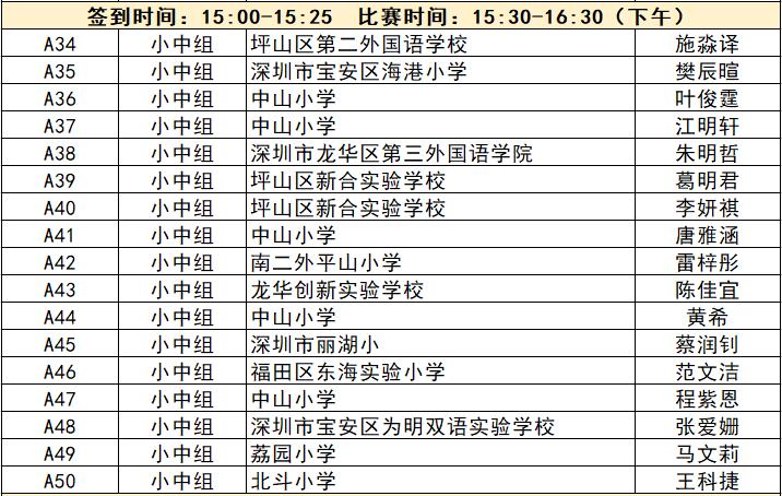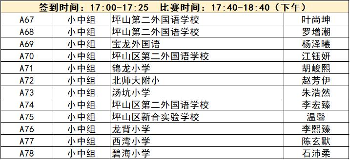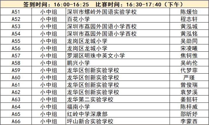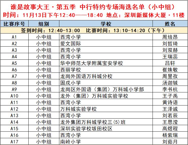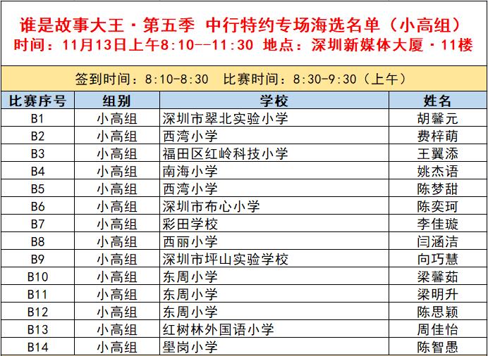 “誰是故事大王·第五季”分為小中組和小高組,此次中行特約專場海選報名的學生將以脫稿的形式,不限主題,在限時5分鐘內(nèi),講述積極健康向上的故事。評委老師們將從四個維度進行評分,其中內(nèi)容占50%、表現(xiàn)技巧占30%、儀態(tài)占10%,以及時間掌控、創(chuàng)意特色呈現(xiàn)等占10%。最終,本場活動將選拔出部分學生晉級“誰是故事大王·第五季”深圳市復賽,他們將和來自指定校園分賽區(qū)、特約專場以及線上分賽區(qū)的選手一起爭奪深圳市決賽名額?,F(xiàn)將上場順序(即所在小組的序號順序)、名單、簽到時間、比賽時間公布如下: