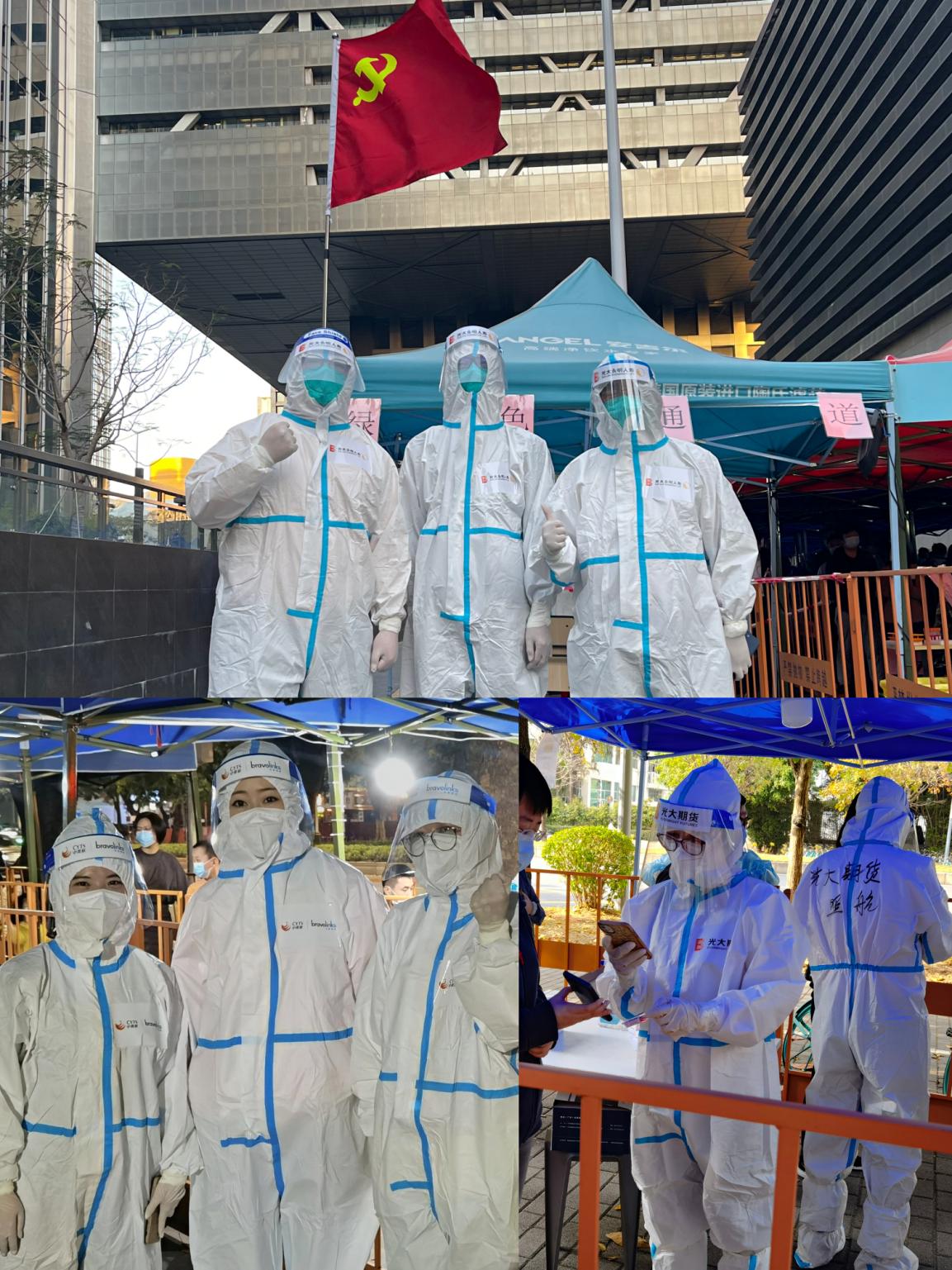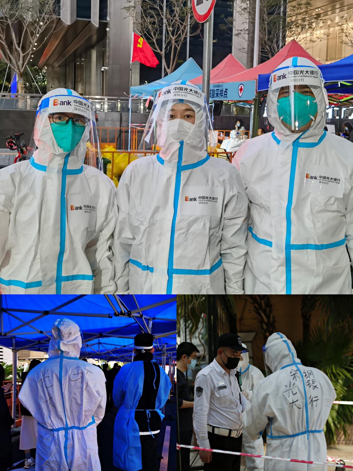 在疫情防控的關鍵時期,深圳分行黨委堅決貫徹落實當?shù)卣姆揽匾?,分行黨委書記、行長韓學智同志緊急召開黨委會議,啟動應急預案,積極部署并投入疫情防控工作,確保日常營運和客戶服務等工作有序運轉。在深圳福田區(qū)金融工作局的組織與號召下,分行黨委要求全體黨員干部發(fā)揮先鋒模范作用,主動為社區(qū)疫情防控工作提供志愿服務。分行黨委委員們率先垂范,分頭帶領黨員干部奔赴社區(qū)慰問抗戰(zhàn)一線工作人員,并犧牲周末休息時間深入社區(qū)核酸采樣點,脫下西裝變身“大白”。深圳分行各黨支部和團支部先后組織開展各類志愿服務累計時長超過100小時,活躍在防疫抗疫一線的同志們在全力保障廣大群眾金融服務需求的同時,和醫(yī)護工作者一同守護著千家萬戶。作為集團駐深企業(yè)協(xié)同工作的牽頭單位,分行牽頭組建駐深企業(yè)志愿者先鋒隊,緊急投身福田區(qū)抗擊疫情的各個戰(zhàn)線和各個角落,不分晝夜、不論疲倦、以實際行動踐行初心、使命和擔當,弘揚新時代共產(chǎn)黨人的奉獻精神。“如果不是親身體驗志愿者服務工作,永遠不知道抗疫人員的工作是如此辛苦!有多少人在負重前行才確保了深圳市民有序和安寧的生活。此刻很想擁抱可親可敬的你們,防護服雖然阻擋了我們的擁抱,但無法阻擋我們一起抗擊疫情的心?!币晃恢驹刚哌@樣記錄到。