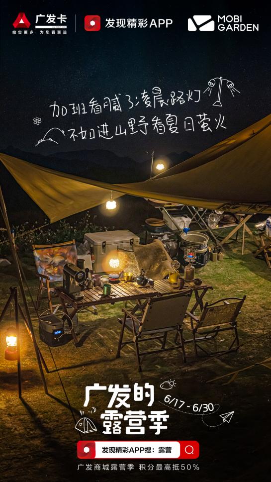 讀特客戶端?深圳新聞網(wǎng)2022年7月6日訊(記者 朱琳)一頂帳篷、一片草地、一桌餐品,呼吸戶外新鮮空氣放松身心……露營逐漸成為年輕人的戶外休閑方式。對此,廣發(fā)信用卡繼推出國內首個沉浸式夜宿露營發(fā)布會之后,近日又以露營主題切入新世代年輕人的需求點,布局戶外露營場景,上線為期兩月的“廣發(fā)的露營季”主題活動,在提倡城市生活“慢下來,去感受”理念的同時,也釋放了一大波戶外露營標配商品的折扣福利干貨。
