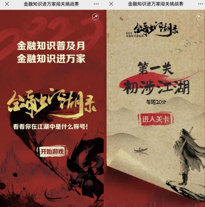 讀特客戶端·深圳新聞網(wǎng)2022年9月28日訊(記者 朱琳)“看,我得了90分,獲得的稱號是‘金融大俠’?!毙炖喜靡獾嘏e著手機(jī)向朋友展示自己游戲成果。原來,這是由太平人壽推出的一款名為“金融江湖錄”的金融知識闖關(guān)互動小游戲。