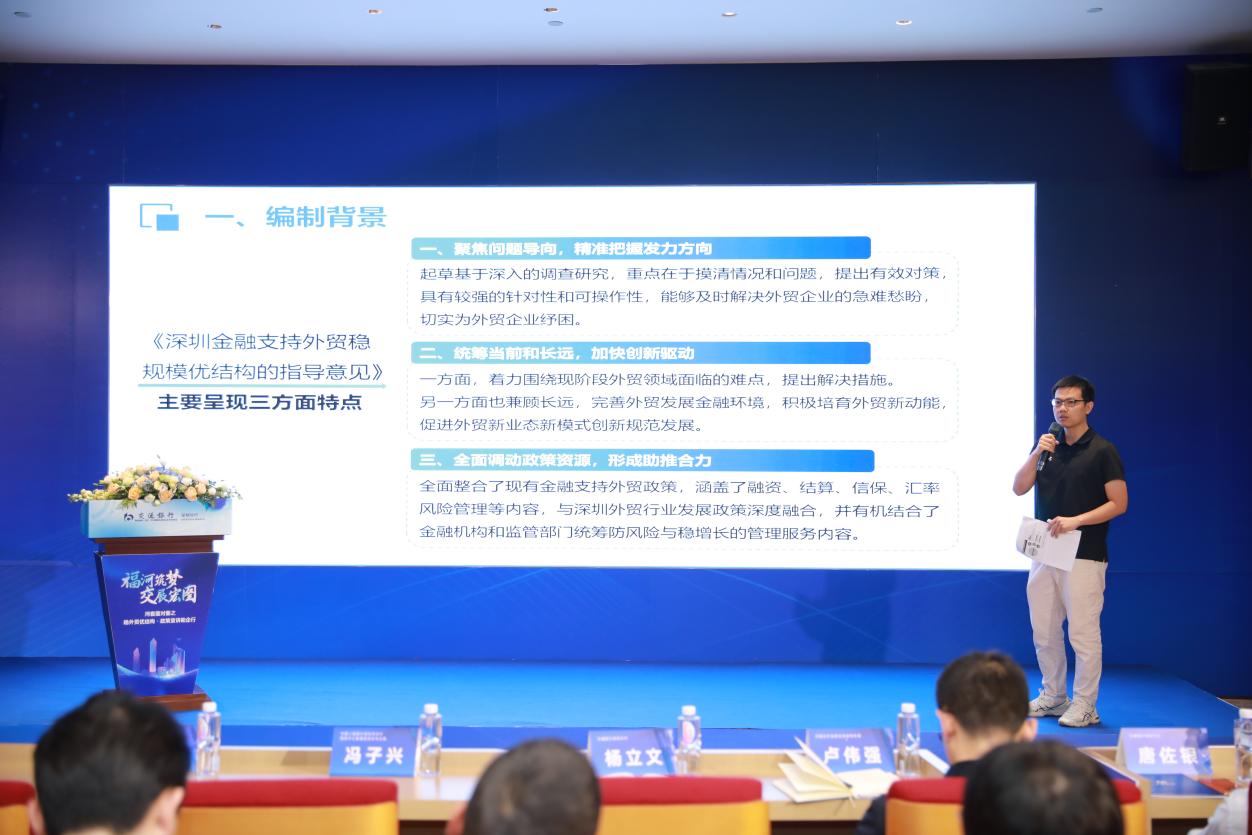 在宣講會上,國家外匯管理局深圳市分局經(jīng)常項目管理處從加大進出口信貸支持、優(yōu)化跨境結(jié)算服務、豐富配套金融支持、抓好工作落實四個方面宣講了金融支持外貿(mào)政策,鼓勵銀行提升金融服務水平、積極支持實體經(jīng)濟發(fā)展。