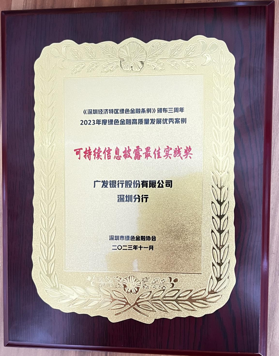 深圳新聞網2023年11月30日訊(記者 朱琳 通訊員 李華鳳)近日,深圳市綠色金融協(xié)會組織開展“2023年綠色金融高質量發(fā)展優(yōu)秀案例評選”活動,表彰貫徹落實《深圳經濟特區(qū)綠色金融條例》、推動綠色金融發(fā)展的最佳實踐,以榜樣力量引領綠色金融高質量發(fā)展的典型。廣發(fā)銀行深圳分行榮獲“可持續(xù)信息披露最佳實踐獎”。