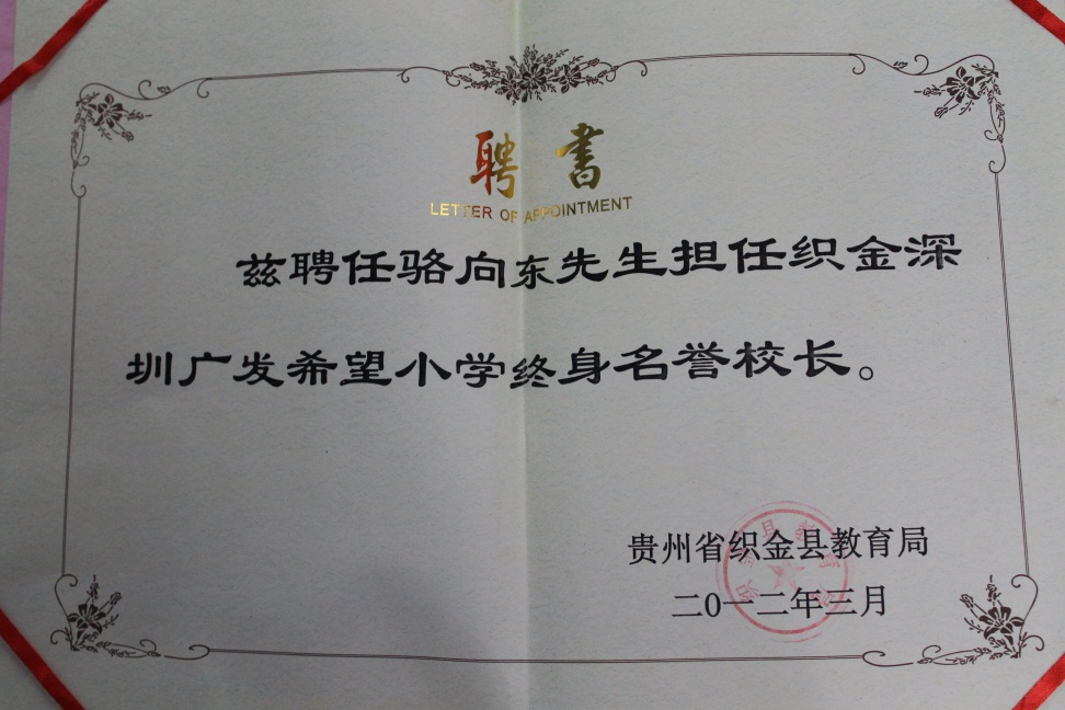 2013年,在駱向東的退休儀式上,織金縣教育局將一張希望小學(xué)終身名譽(yù)校長的聘書,鄭重交到了他的手上。“我很榮幸能代表廣發(fā)銀行深圳分行黨委去推動(dòng)這件事,但公益事業(yè)任重道遠(yuǎn),我相信愛心基因會(huì)在廣發(fā)一直傳承下去?!笔聦?shí)也正如駱向東所言,從1998年籌建希望小學(xué)至今,一代代廣發(fā)人身體力行,讓愛心助學(xué)一棒接力一棒。