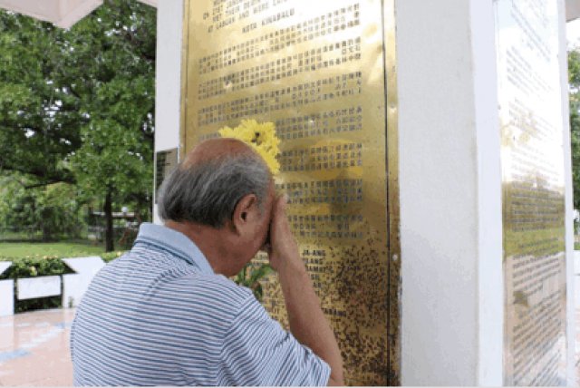 2018年6月22日,我攜兒子宇懷及侄子道存、洪濤一行四人踏上萬里尋親之旅,遠(yuǎn)涉重洋,飛抵沙巴。抵后連日驅(qū)車走訪烈士后裔、尋找知情華僑老人、憑吊當(dāng)年舊戰(zhàn)場Inanam大橋、瞻仰游擊隊(duì)大本營Menggatal文茜坑、參訪中國駐哥打基納巴盧總領(lǐng)事館,拜見梁才徳總領(lǐng)事、劉雅楠領(lǐng)事。6月24日上午,在《北婆羅洲抗日神山游擊隊(duì)》紀(jì)實(shí)文學(xué)作者陳冬和先生和83歲高齡的抗日烈士后裔石硯田老先生的陪同下,一行來到肅穆的神山游擊隊(duì)紀(jì)念公園。公園正面牌樓的“神山游擊隊(duì)紀(jì)念公園”名,白底黑字,分別用中、英、馬來文書寫,顯得格外莊重醒目,門樓上飄揚(yáng)著馬來西亞國旗,烈士紀(jì)念碑巍然矗立于公園中央,碑前廣場瓷磚鋪就,廣場中間有一片用砌磚圍著的長方形草坪,據(jù)說是當(dāng)年烈士遇害的大土坑,戰(zhàn)后被填平,上面綠草如茵,地下掩埋著哥哥張桂有等176位神山游擊隊(duì)英烈遺骸。紀(jì)念碑的四周銅牌鑲嵌,正面鐫刻著176位烈士的英名,其余三面是中、英、馬來三種文字銘刻的碑記。當(dāng)我在烈士紀(jì)念碑上找到哥哥張桂有的名字,不禁百感交集,久久伏碑,撫摸著張桂有三個(gè)漢字,壓抑已久的眼淚再也控制不住,奪眶而出,抱碑嗚咽!75年了,終于找到了多年思念尋覓的親人!哥哥當(dāng)年與鬼子英勇拼殺的激烈場面、慷慨就義的壯烈情景一幕幕浮現(xiàn)在面前。我們?cè)诩o(jì)念碑前獻(xiàn)上鮮花,深深鞠躬默哀,深切悼念我的家兄張桂有和他的戰(zhàn)友們。我想此時(shí)此刻,哥哥和戰(zhàn)友們的英靈一定在冥冥里接受我們的祭奠。
