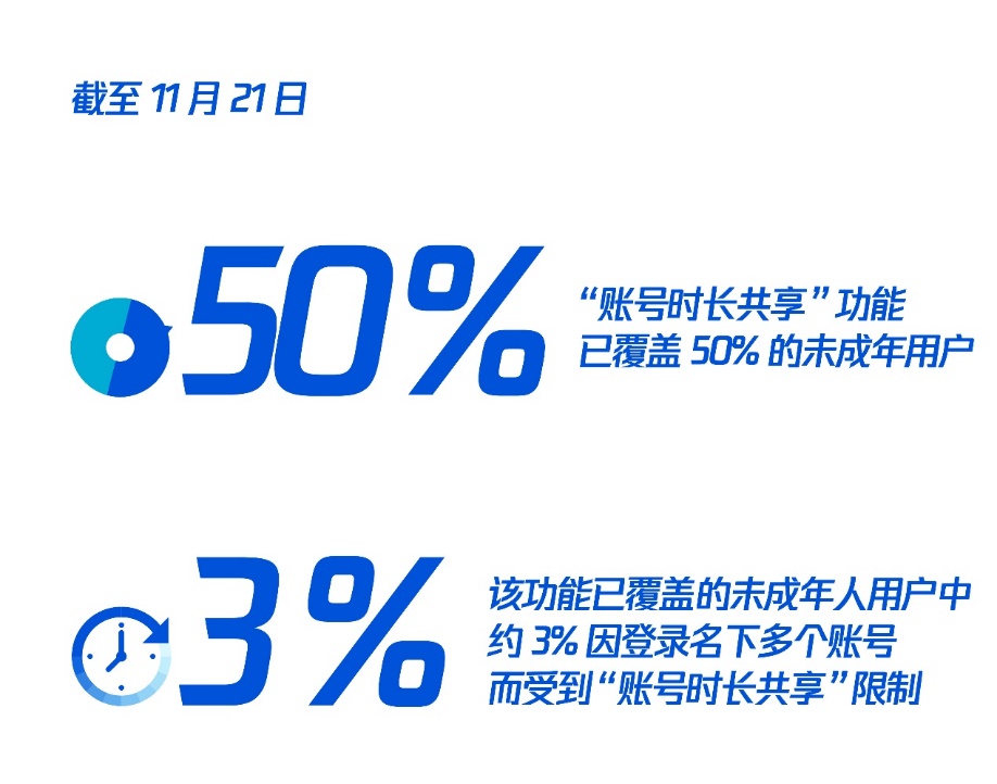 11月15日在《王者榮耀》啟用的“賬號時長共享”功能,基于自然人身份對未成年用戶名下賬號的總游戲時長進(jìn)行合并計算,目前正在逐步發(fā)揮效力。