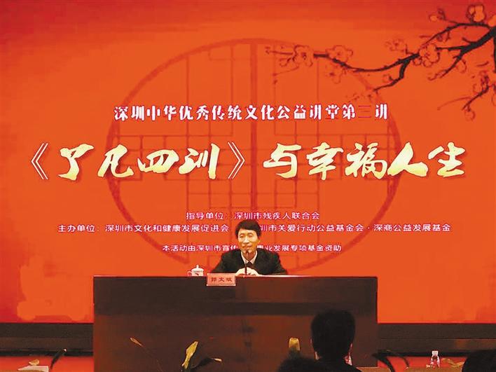 深圳商報2019年03月18日訊 (記者 夏和順/文 韓墨/圖)近日,深圳中華優(yōu)秀傳統(tǒng)文化公益講堂第三場在深圳市殘疾人綜合服務(wù)中心開講,這也是傳統(tǒng)文化講堂首次“送課上門”。著名作家郭文斌與市殘聯(lián)系統(tǒng)200多名干部分享“東方勵志奇書”《了凡四訓》所蘊含的人生哲理,探討“安詳生活理念”與幸福人生的關(guān)系。據(jù)介紹,本次活動由中華炎黃文化研究會文明傳承委員會、深圳市文明辦指導,深圳市文化與健康發(fā)展促進會主辦。