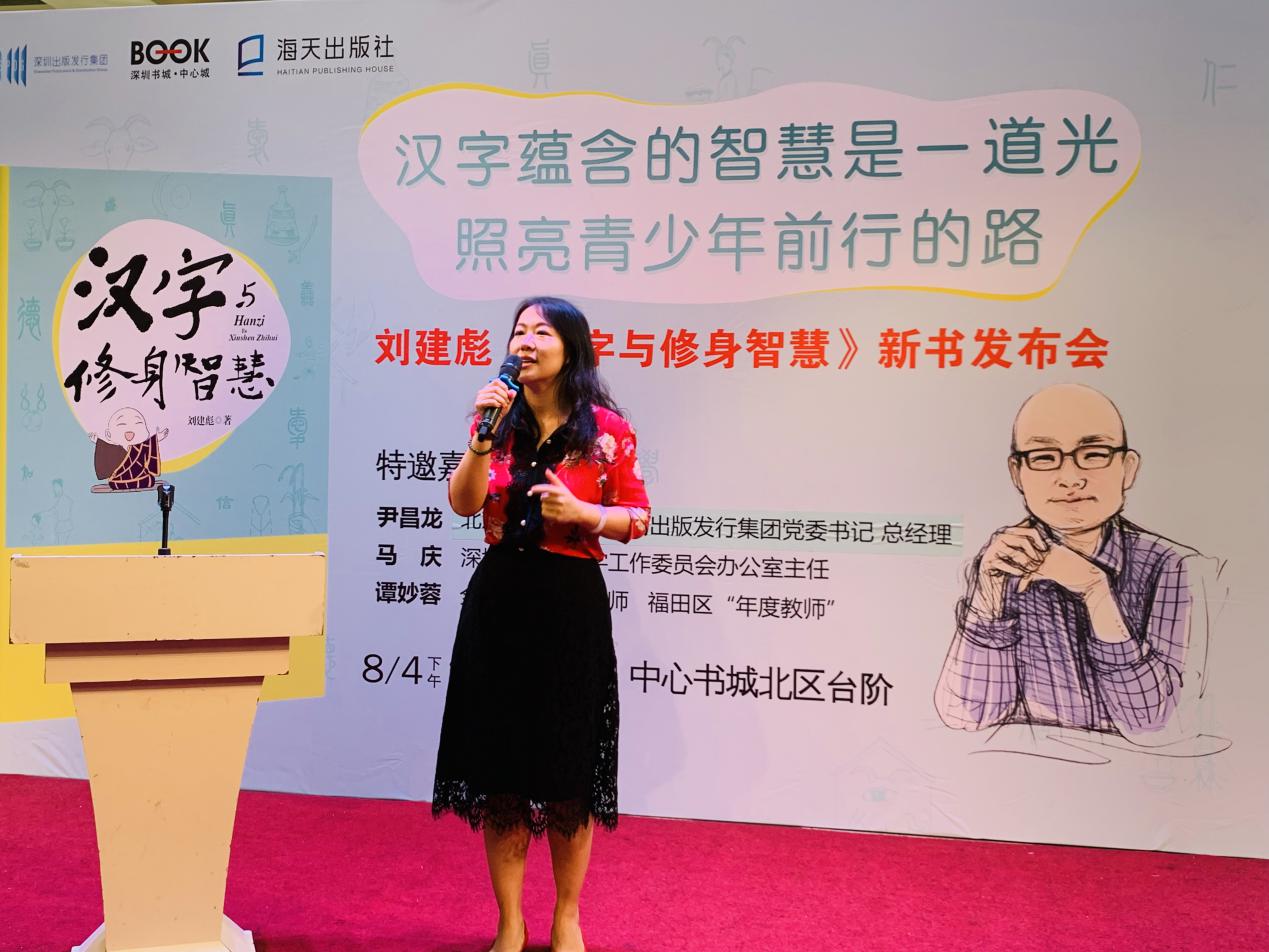 深圳出版發(fā)行集團(tuán)黨委書記、總經(jīng)理尹昌龍?jiān)诎l(fā)言中指出,漢字里蘊(yùn)藏著中華文明的密碼,而《漢字與修身智慧》這本書恰是從漢字出發(fā),解讀中華文化的基因,以美德教育為旨?xì)w,有助于喚起我們對(duì)漢字的熱愛,對(duì)民族文化的自信。他向在場觀眾推薦這本書,并指其信息量大,兼具趣味性、可讀性與啟發(fā)性,值得細(xì)細(xì)品味。另外,馬慶主任表示,漢字投射的是古人的心靈,古人的智慧,古人的修養(yǎng),他贊嘆《漢字與修身智慧》一書為深圳的文化積累做出了貢獻(xiàn),并鼓勵(lì)親子共讀,共同成長。譚妙蓉老師也力薦此書,認(rèn)為書中漢字心能量中的小故事深入淺出,富含哲理,對(duì)青少年乃至成年人美德教育均有借鑒作用,并聲情并茂地朗誦了書中的《陋室銘》一文,她希望作者將來能創(chuàng)作出更多關(guān)于漢字的書,讓更多讀者感受到傳統(tǒng)文化的熏陶與滋養(yǎng)。