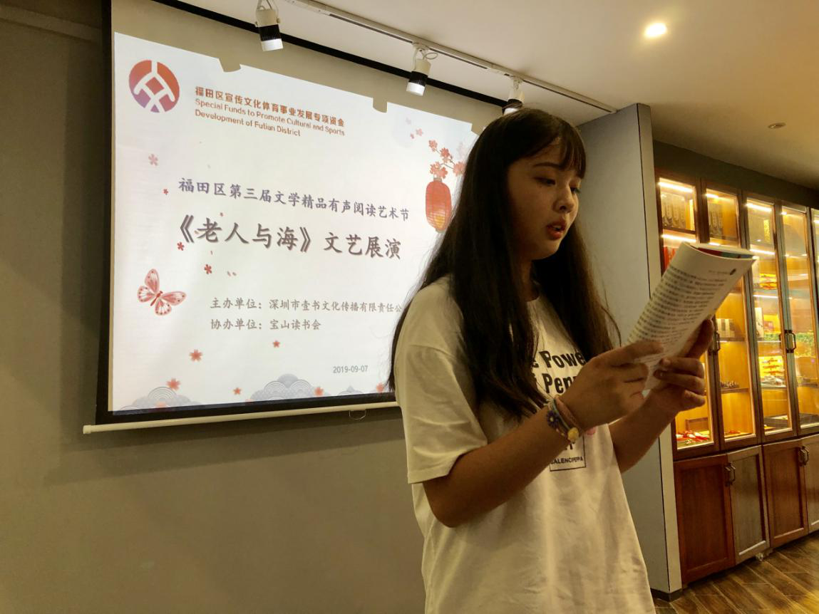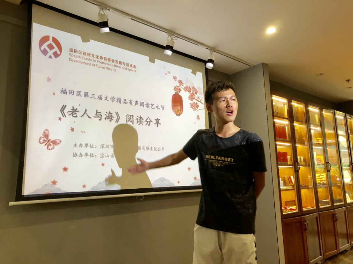 深圳新聞網(wǎng)訊 2019年9月7日,由深圳市壹書文化傳播有限責(zé)任公司主辦、寶山讀書會協(xié)辦的“福田區(qū)第三屆文學(xué)精品有聲閱讀藝術(shù)節(jié)”之《老人與?!烽喿x分享會暨文學(xué)作品朗誦會在簡閱書吧香蜜湖店成功舉辦。來自深圳市寶山技工學(xué)校的學(xué)子們在主講人的啟示下分享閱讀感悟、誦讀精彩文摘,在文藝展演中體會圣地亞哥抗擊命運(yùn)的人生哲學(xué)。