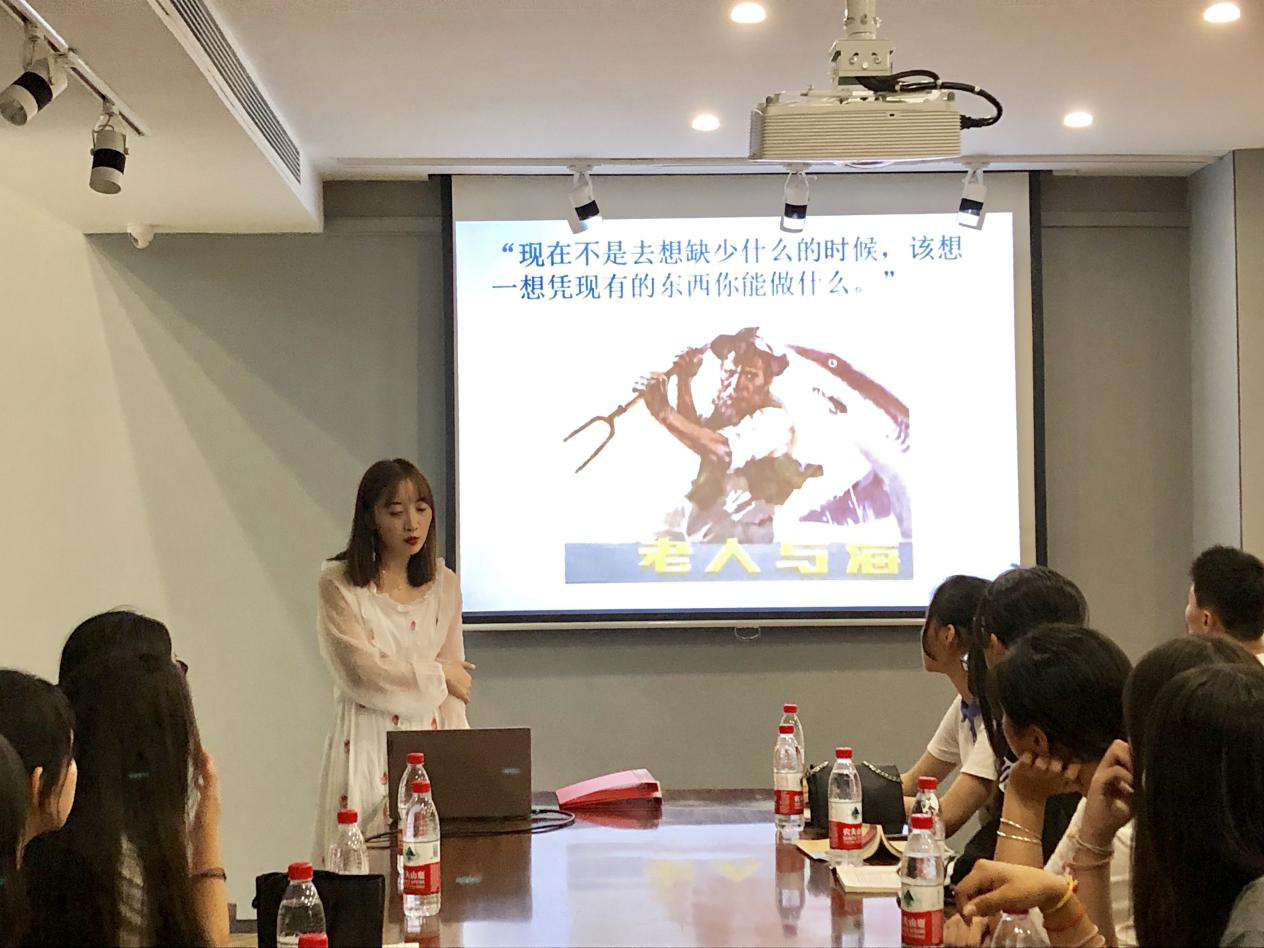 《老人與?!吠ㄟ^講述一個老漁夫的故事,揭示了人類共同的命運(yùn),給讀者帶來關(guān)于勇氣、不屈不撓、與命運(yùn)作斗爭的精神啟迪。圍繞“生而為人,請務(wù)必戰(zhàn)斗到底”這一主題,邵洋提出了“是選擇放棄,還是一往直前?”這一問題,引起在座同學(xué)的思考。隨后,她又通過解讀《老人與海》中的喻象與藝術(shù)、生命與理想,為同學(xué)們總結(jié)值得學(xué)習(xí)的寫作思路。