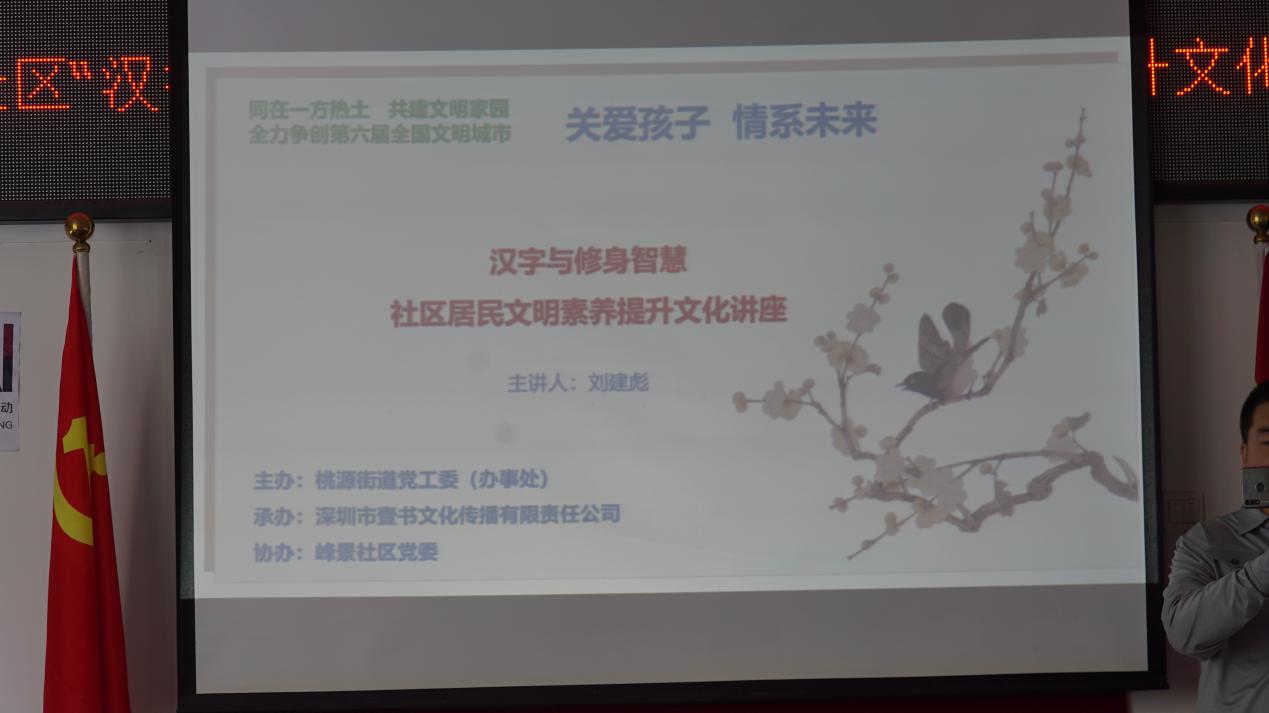 深圳新聞網(wǎng)訊 為切實(shí)做好桃源街道辦創(chuàng)建第六屆全國文明城市迎檢工作,提升轄區(qū)居民的文明素養(yǎng),桃源街道辦攜手壹書文化在11月份開展“‘漢字與修身智慧’社區(qū)居民文明素養(yǎng)提升”項(xiàng)目,由《漢字與修身智慧》作者劉建彪到桃源街道辦轄區(qū)內(nèi)12個(gè)社區(qū)開展12場“‘漢字與修身智慧’社區(qū)居民文明素質(zhì)提升”專題講座,從中華文明的基因(漢字)出發(fā),解讀深圳市民公約,旨在啟發(fā)居民在優(yōu)秀傳統(tǒng)文化的感召之下,修身潤德,踐行文明禮儀,用實(shí)際行動(dòng)去推進(jìn)文明城市的創(chuàng)建。