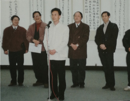1996年組織深圳市青年書法家赴江蘇省美術(shù)館舉辦《深圳青年書法展》。這是深圳特區(qū)成立以來(lái)深圳青年書法家第一次到外省集體亮相交流,圖為金龍?jiān)陂_(kāi)幕式上致詞。