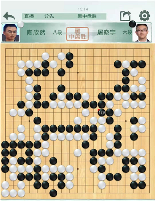 第三臺(tái),陶欣然執(zhí)白負(fù)屠曉宇。開局左下角形成流行的大型變化,結(jié)果大致兩分局面。右上角黑棋103行棋次序失誤,但是白棋106沒有把握住在黑空里面斷一個(gè)出棋的好機(jī)會(huì)之后,黑稍好。白中央114與黑互相破空急躁,導(dǎo)致局面惡化。最終白棋破釜沉舟選擇舍棄中央殺黑右下角,轉(zhuǎn)換后依然白棋敗勢遂認(rèn)負(fù)。