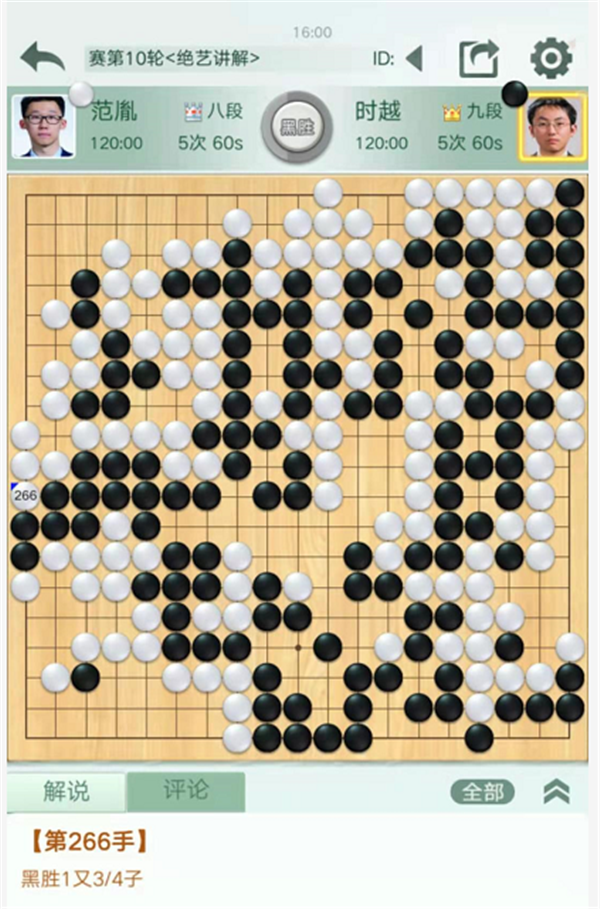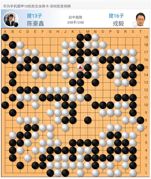 第一臺(tái),快棋,戎毅執(zhí)白勝陳豪鑫。黑棋開局在右邊以及中盤在左上的下法略嫌松緩,白領(lǐng)先。之后黑棋沖擊白棋中央致使左邊形成打劫,白棋簡明處理后以較大優(yōu)勢進(jìn)入官子。最后黑棋為了強(qiáng)撐一目棋在自己空里出現(xiàn)打劫,在黑棋需要找很損的劫材時(shí)候黑方認(rèn)輸。
