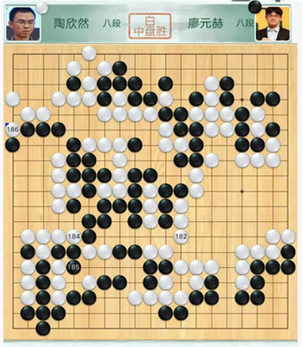 第四臺(tái)慢棋,由深圳隊(duì)陶欣然八段執(zhí)白對(duì)陣成都隊(duì)廖元赫八段。中央戰(zhàn)斗時(shí)候白棋選擇退讓,反倒形成打劫,黑棋劫勝后大幅領(lǐng)先。之后黑棋官子階段不夠冷靜細(xì)膩,幾處小虧損之后被白反超。黑棋看到局面危險(xiǎn)更加沖動(dòng)的選擇和白棋互相破空,結(jié)果又虧損導(dǎo)致差距越來(lái)越大。陶欣然執(zhí)白中盤勝廖元赫。